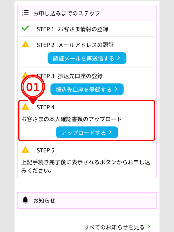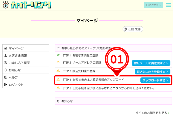 マイページにログインし、「本人確認書類のアップロード」ページにアクセスしてください。