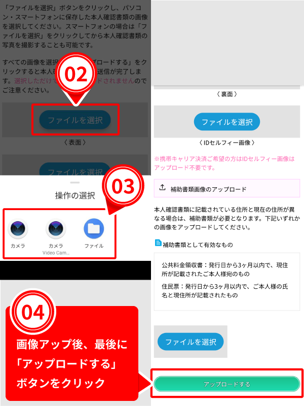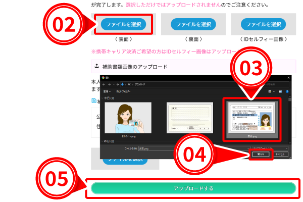 マイページの専用フォームより、本人確認書類の「表面」と「裏面」、そして「ご本人様のお顔と本人確認書類が1枚に収まっている画像(IDセルフィー)」の3点をアップロードしてください。